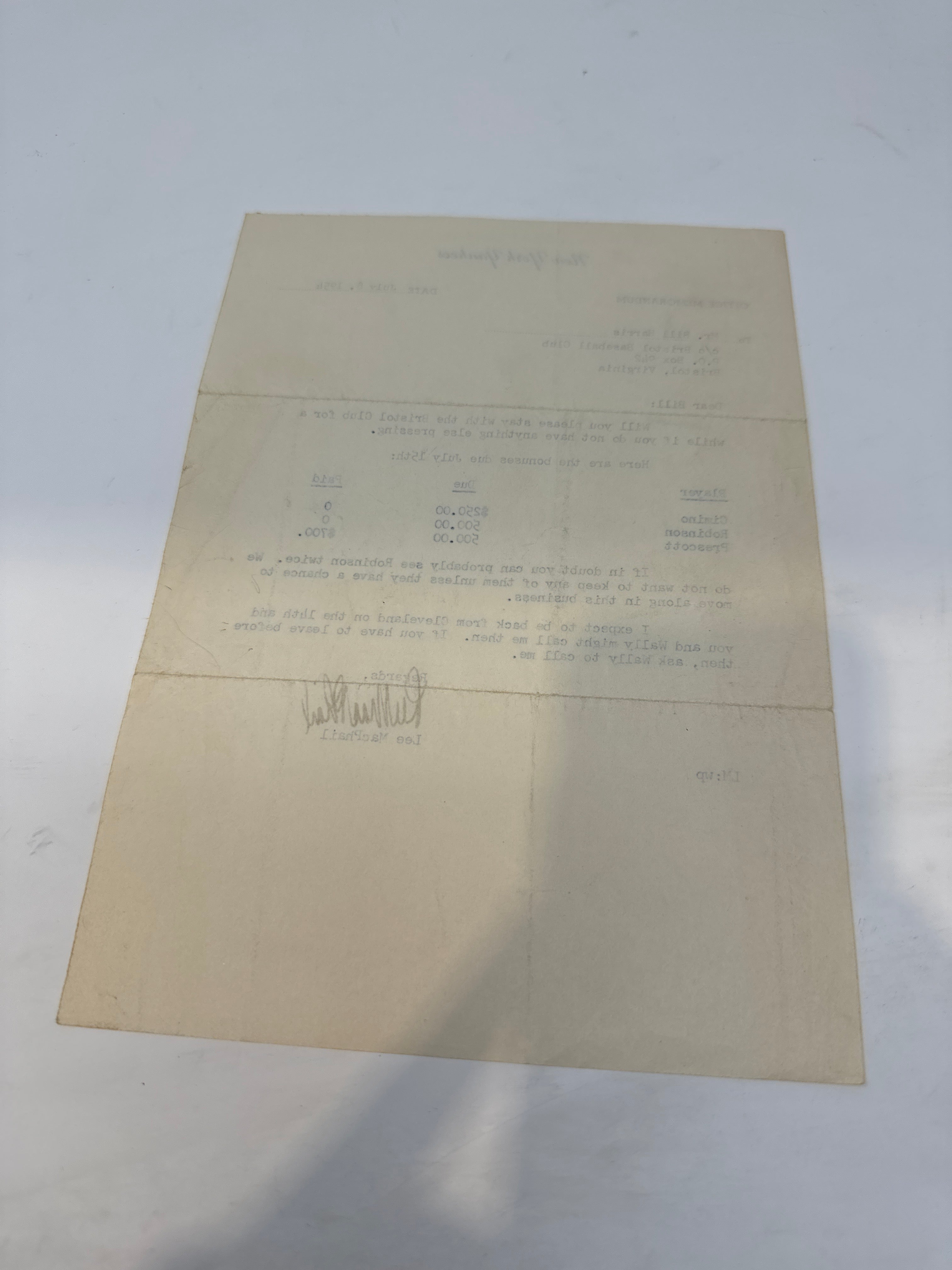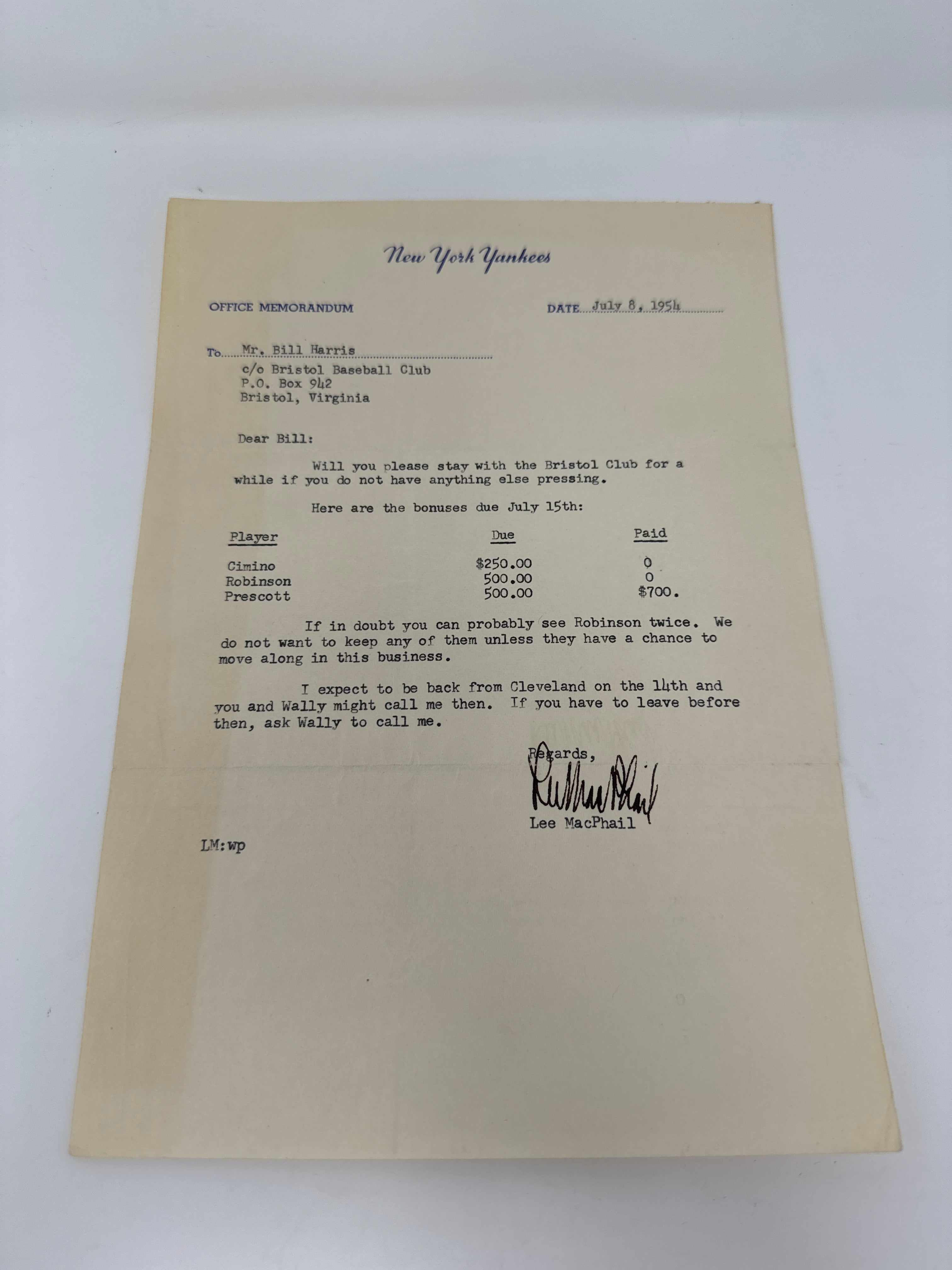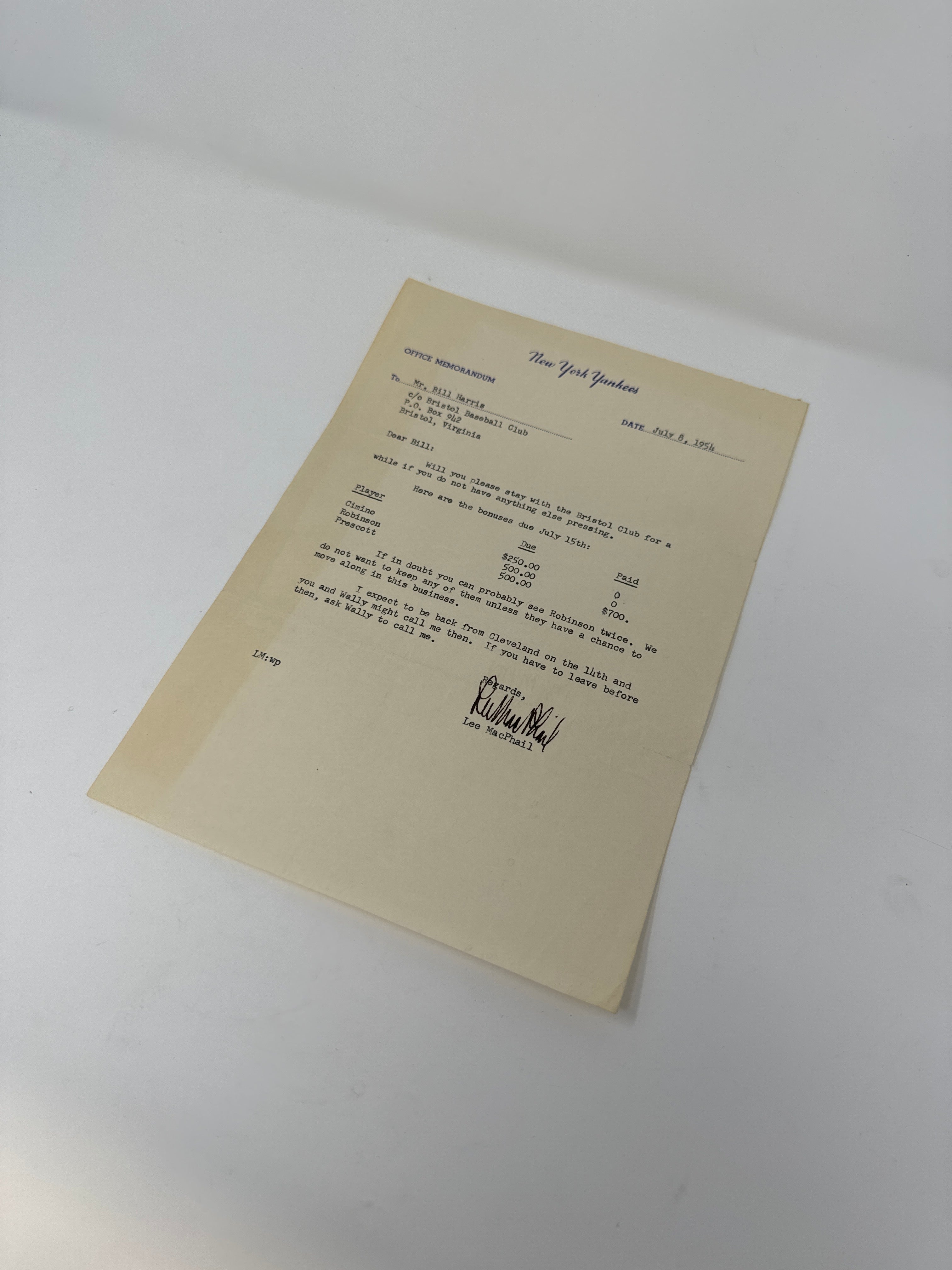 AUCTION - 1954 New York Yankees Office Memorandum (Bristol Baseball Club) Collectible Paperwork Lee MacPhail